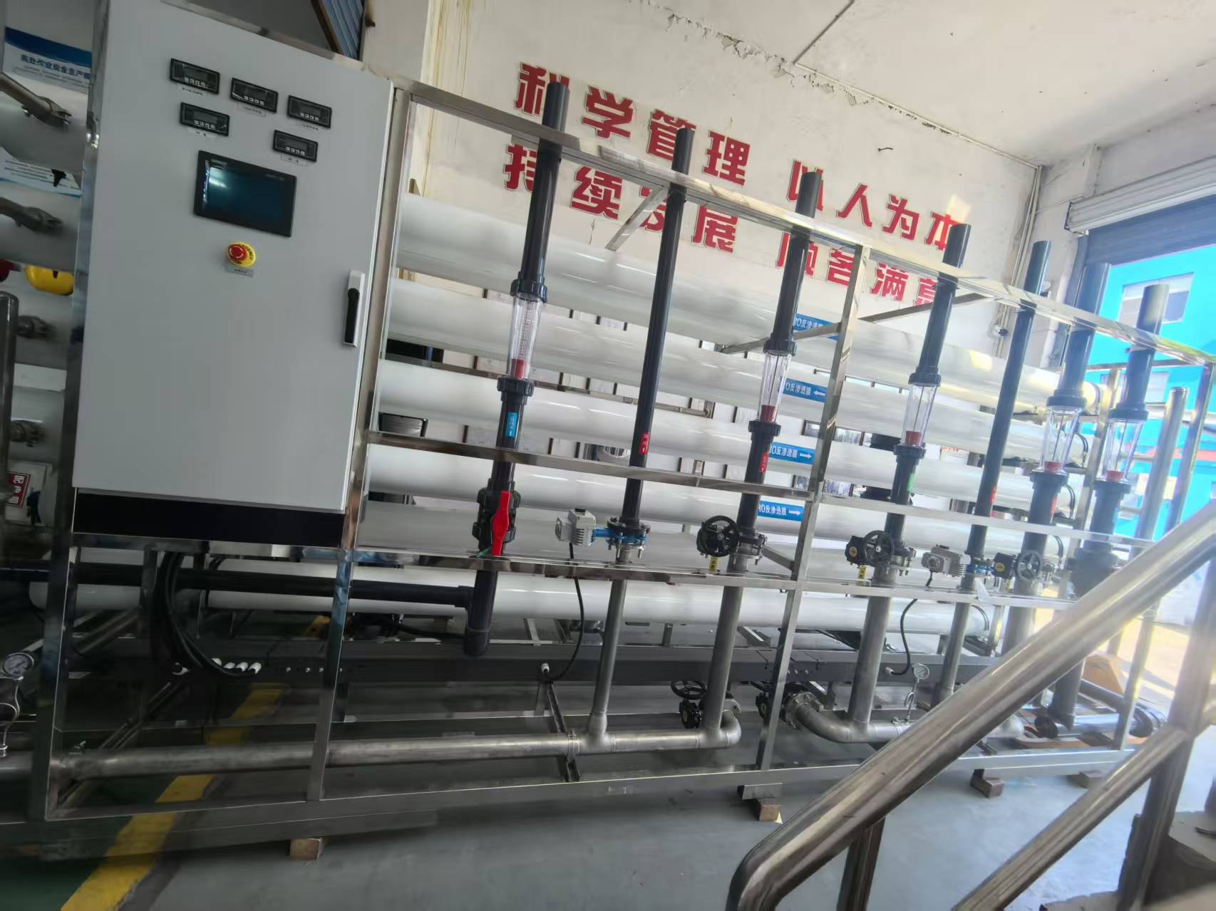 一级产水经二次增压后进入第二级RO系统,采用更高精度的膜元件进行再次过滤,进一步去除残留的微量离子和小分子有机物。经过两级处理,产水电导率可降至<10 μS/cm,部分系统可达1 μS/cm以内,满足高纯水需求。后处理与储存
